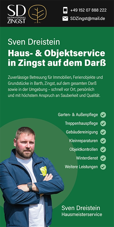 Vom privaten Ferienhaus bis zur Wohnanlage – ein professioneller Flyer schafft Vertrauen bei Eigentümern und Vermietern. Präsentieren Sie Ihre Leistungen rund um Hausmeisterservice, Objektpflege und Instandhaltung, zeigen Sie Erfahrung und regionale Präsenz in Zingst und auf dem Darß. Mit klarer Übersicht, sympathischer Ansprache und allen Kontaktdaten wird aus Interesse eine langfristige Zusammenarbeit, zuverlässig, persönlich und kompetent begleitet.